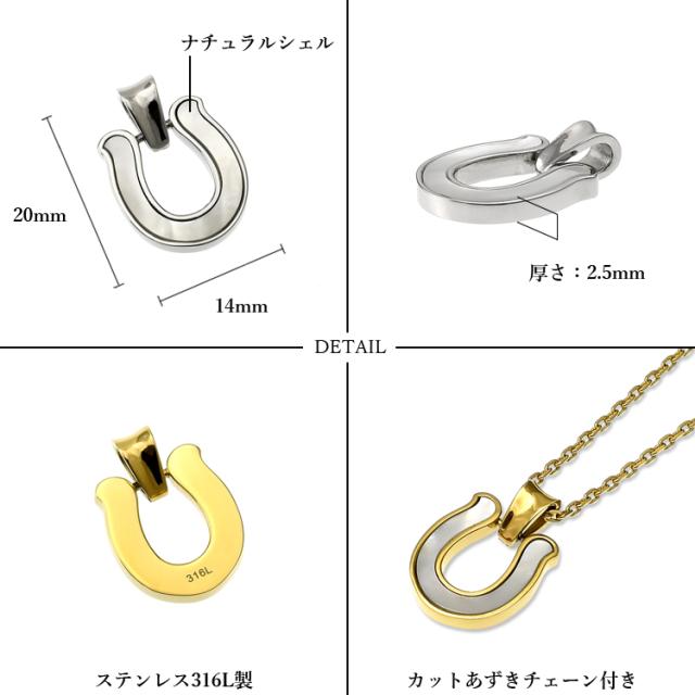幸運の象徴として有名なホースシュー(馬蹄)モチーフに、光沢美しいナチュラルシェルをあしらったお洒落なペアネックレス。U字が上向きになった馬蹄には、「幸運を受け止め満す」という意味が込められています。素材にはサージカルステンレス316Lを使用しているので、金属アレルギーの方にも安心してお使いいただけます。