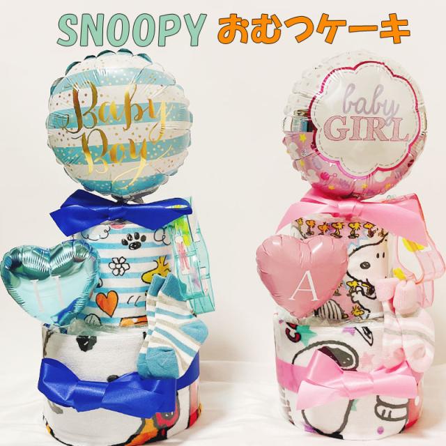 おむつケーキ スヌーピー 男の子 女の子 出産祝い snoopy オムツケーキ 男 女 2段おむつ かわいい ギフト パンパース 誕生日 百日 ハーフバースデー 初誕生 お祝い プレゼント イニシャル付き