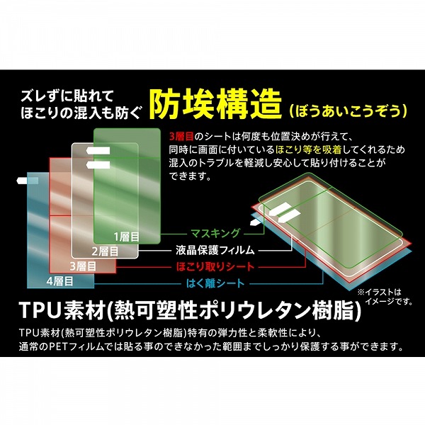素材: シリコン膜(液晶保護フィルム吸着面)、TPU(液晶保護フィルム表面)