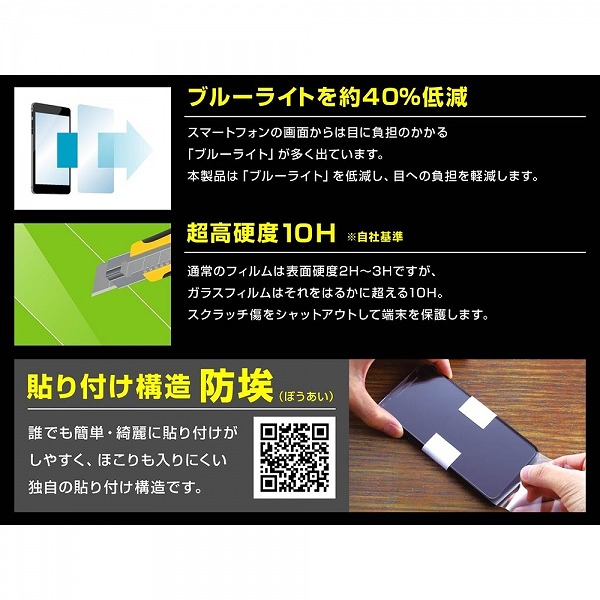| 商品の説明 | 特殊素材によるガラス強化で衝撃を分散、吸収させます。耐衝撃性は通常ガラスの約5倍です。スマートフォンの画像からは目に負担のかかる「ブルーライト」が多く出ています。本製品は「ブルーライト」を低減し、目への負担を軽減します。通常のフィルムは表面硬度2H-3Hですが、ガラスフィルムはそれをはるかに超える10H。スクラッチ傷をシャットアウトして端末を保護します。誰でも簡単・綺麗に貼り付けがしやすく、ほこりも入りにくい独自の貼り付け構造 |