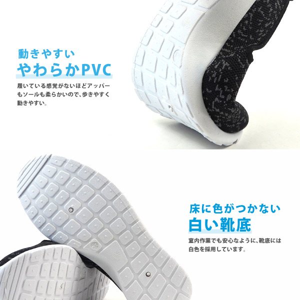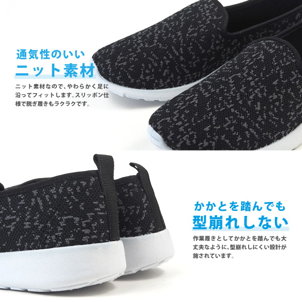 | 特徴 | 通気性の良いニット素材&しなやかなPVCソールで快適な歩きやすく動きやすいスリッポンスニーカー。 室内外で履けるので仕事履きとしてもオススメです。 ・通気性の良いニット素材 ・かかとを踏んでも型崩れしない ・動きやすい柔らかPVCソール ・床に色がつかない白い靴底 | |||||||