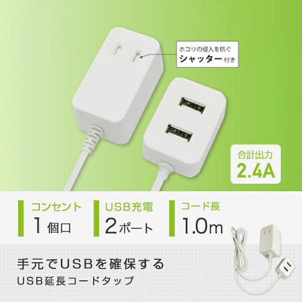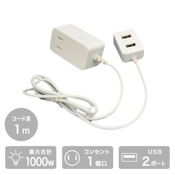 電源タップ 1個口電源タップ コンセントタップ 延長タップ 延長コード TPE10-WT 1個口タップ 1.0m USBポート USB2ポート 急速充電 たこ足 タコ足 コンセントタップ スマートフォン タブレット TOPLAND トップランド 【送料無料】