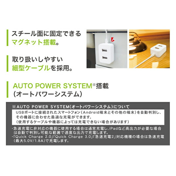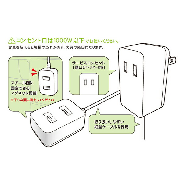 | 商品説明 | ●【コンセント差し込み口】 ●定格入力:AC100V-125V 50/60Hz ●差し込み口:合計1000Wまで ●差し込み口数:2個口 【USBポート】 ●定格出力:DC5V 合計2.4A(最大) ●コネクタ形状:Aタイプ ●ポート数:2個口 ●オートパワーシステム搭載 ※USBポートに接続されたスマートフォン(Android端末とその他の端末)を自動判別し、その機器に合わせた最適な充電ができます ●スチール面に固定できるマグネット搭載 ●コンセントへのホコリの侵入を防ぐシャッター付き ●コード長:約1.0m ●メーカー保証:1年 |