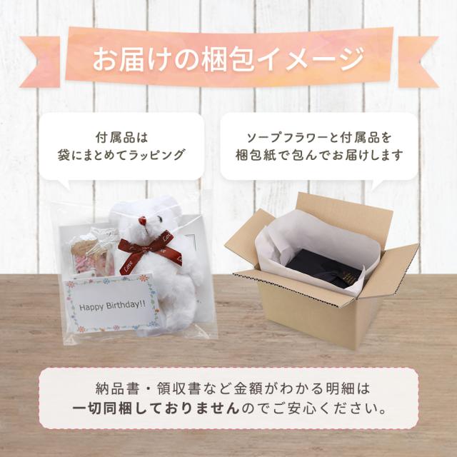 - 友人の還暦祝いにプレゼントとして渡す予定にしています。綺麗なソープフラワーと可愛いクマさん満足しています。