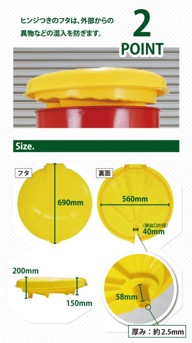 廃油の移し替えを安全・簡単に! ●200Lドラム缶にぴったりフィットします ●廃油の移し替えが安全に容易にできます ●ヒンジつきのフタは、外部からの異物などの混入を防ぎます ●ファンネル内面のデコボコの突起により、中央に液体が自然と集まります ●ポリエチレン製で耐久性が高く、錆びや腐食がありません ※ドラム缶は付属しません 品番:DF |
