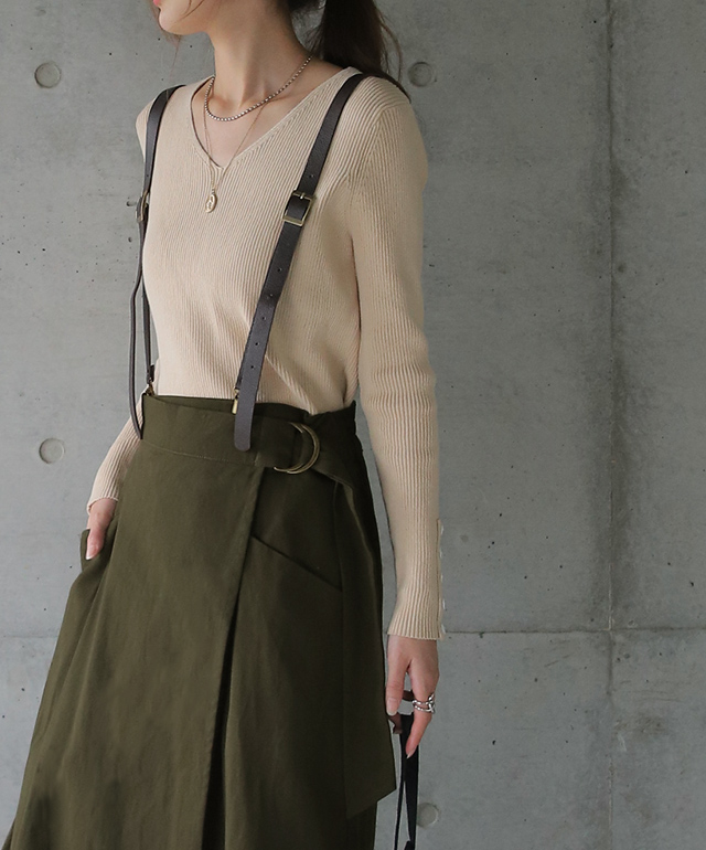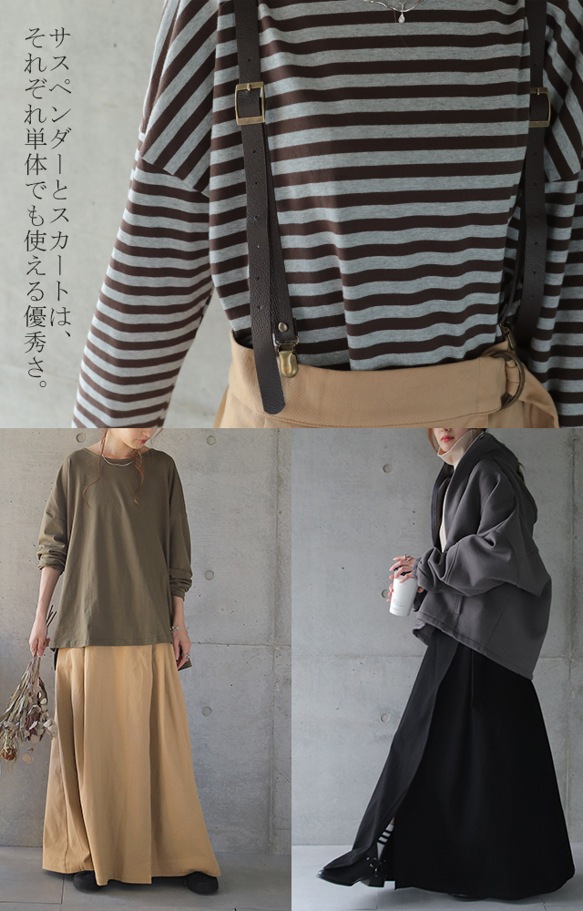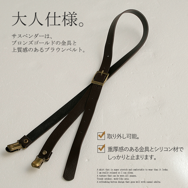 サスペンダーは取外しも出来るのでコーデの幅も広がる一着。