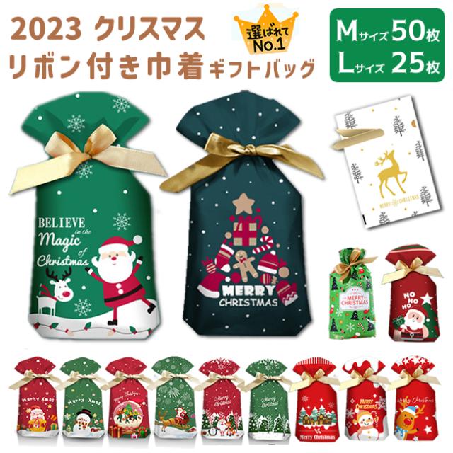 ラッピング 袋 クリスマス ギフトバッグ クリスマスラッピング袋 お菓子袋 巾着袋 リボン付 かわいい プレゼント用 贈り物 包装袋 23*34*6cm50枚 23*15cm*6cm25枚 M、Lサイズ オシャレ