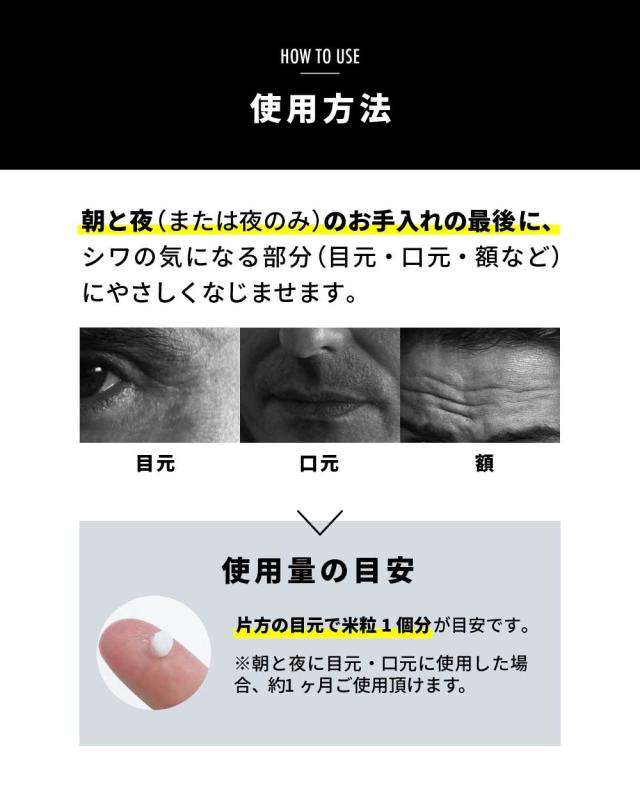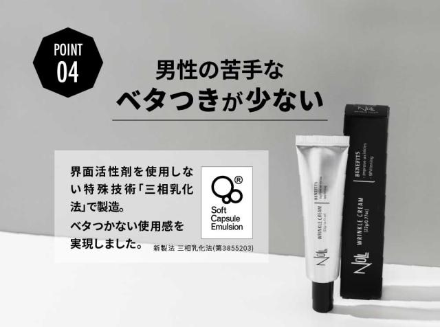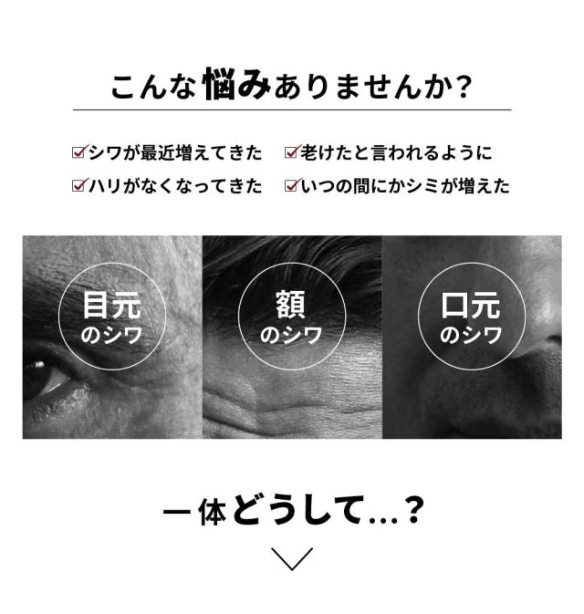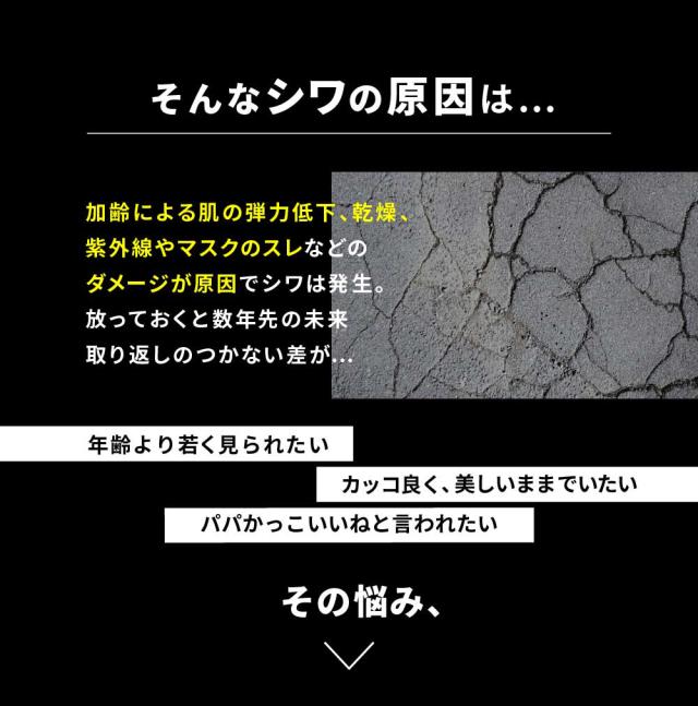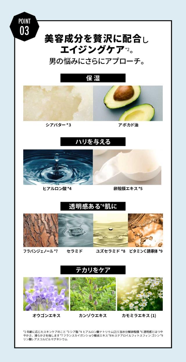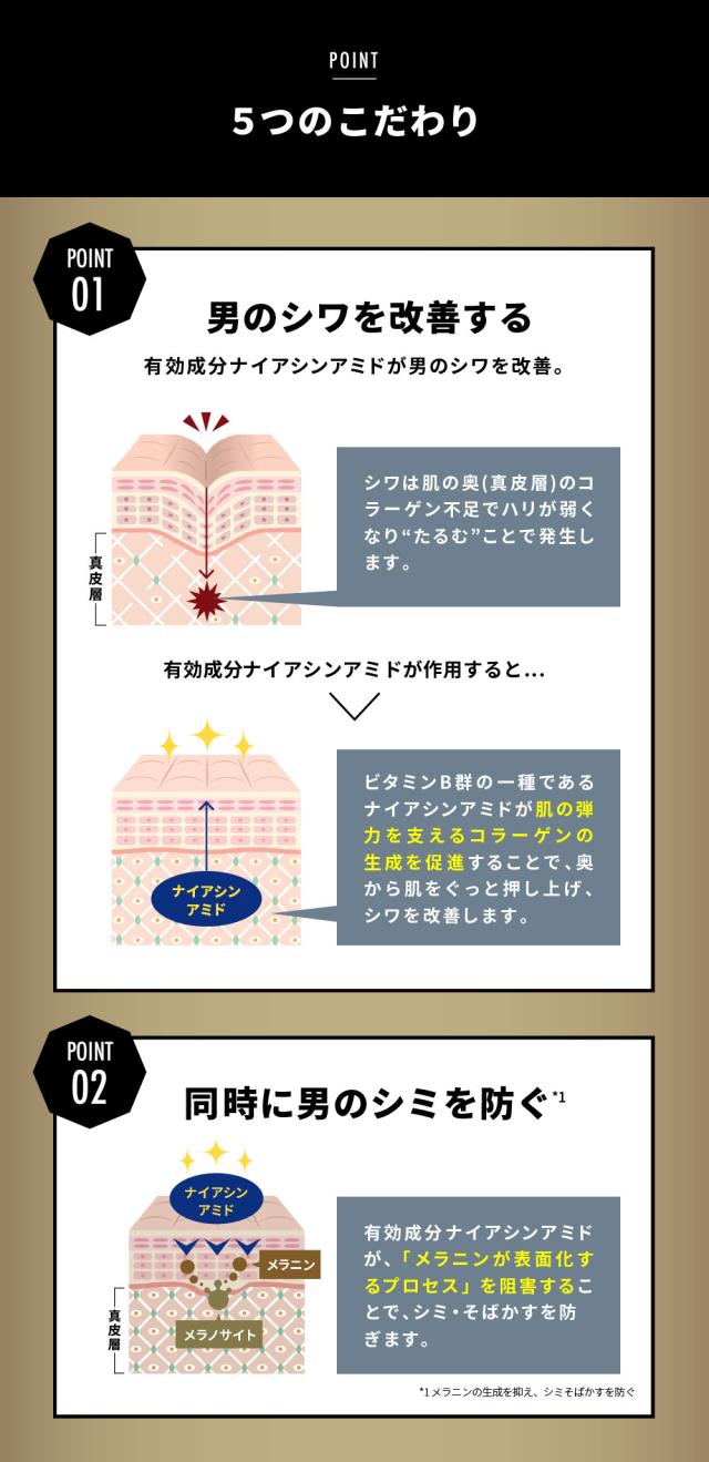 【シワを改善する】薬用有効成分ナイアシンアミドが男性のシワを改善します。ビタミンB群の一種であるナイアシンアミドが肌の弾力を支えるコラーゲン生成を促進して、奥から肌をぐっと押し上げ、シワを改善します。