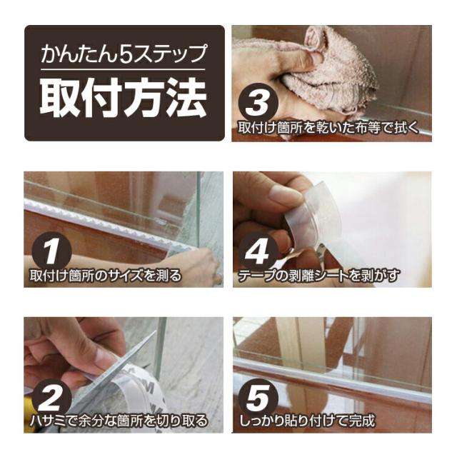- 風呂の扉の補修に購入しました。1度取り付けましたが、風呂扉なので剥がれてしまい、100円ショップで両面テープを購入し張り直しました。これと同様の隙間テープが100円ショップに有りました。