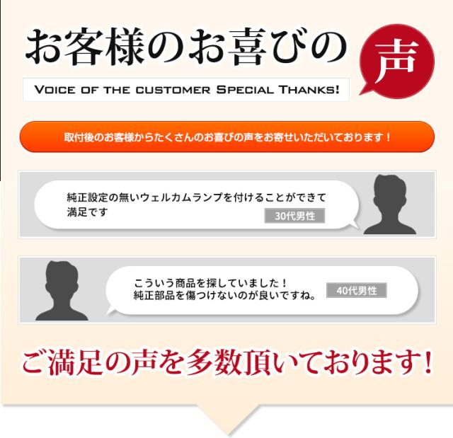 | 注意事項 | ■本品またはご使用の際のキズ・破損等に対する保証はございません。ご使用は自己責任にてお願い致します。 ■両面テープを剥がした場合はいかなる理由でも返品交換対応はできません。装着前に必ず状態の確認・点灯確認を行ってから貼り付けるようにしてください。 |