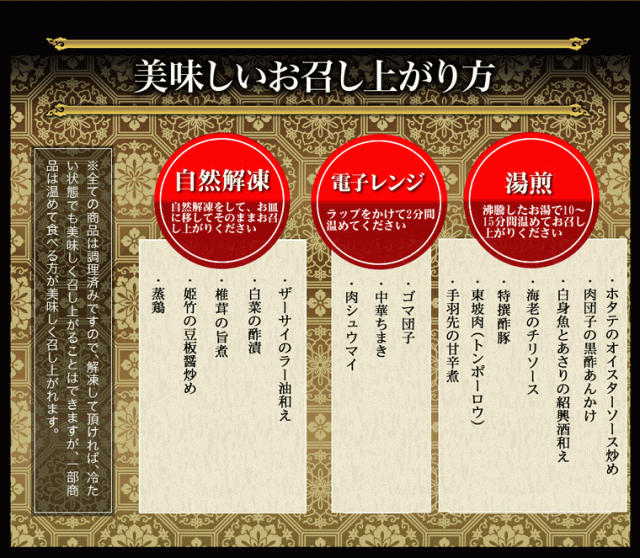 2、冷凍真空パック(一部商品を除き)でお届けさせていただきますで、お客様ご自身で湯煎、電子レンジ、自然解凍の作業が必要となります。