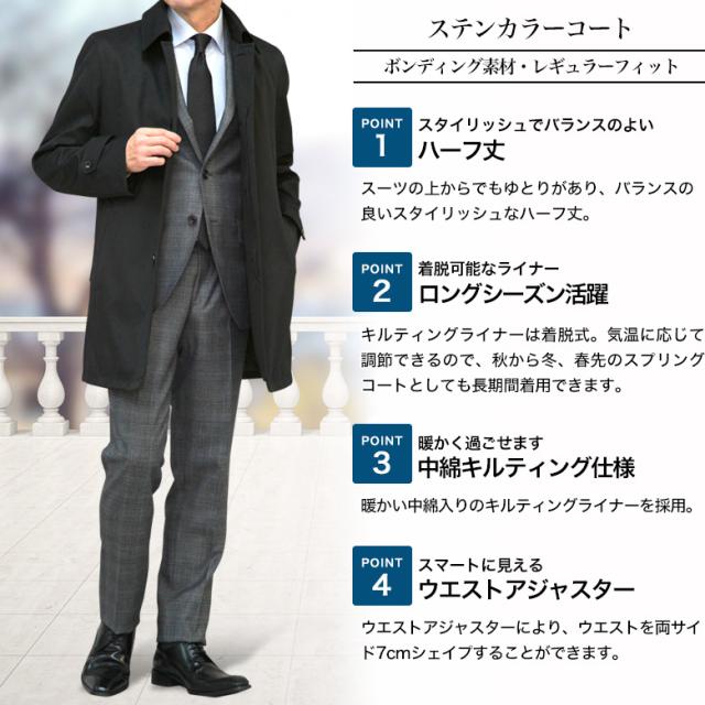 | ボンディング素材ステンカラーコート・キルティングライナー着脱式 ステンカラーコートは汎用性が高く着回し力抜群。軽くてシワになりにくく、撥水加工で水性・油性の汚れを弾きメンテナンスが楽々です。スーツの上からでもゆとりがありバランスの良いスタイリッシュなハーフ丈。前立てはボタンの見えないフライフロント(比翼仕立て)のスタンダードスタイルです。キルティングライナーは着脱式で、気温に応じて調節できるので秋から冬、春先のスプリングコートとして長期間着用できます。素材は生地を貼り合わせたボンディング素材で風を通さず保温性に優れ、撥水加工で水をはじき、雪の付着も防ぐので荒天時でもご着用いただけます。軽快で保温性も高く、オンオフ使えるユーティリティなステンカラーコートはビジネスマンにおすすめのアイテムです。 |