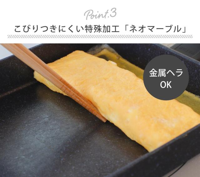 内面はこびりつきにくく、耐摩耗性に優れた4層コート「ネオマーブル」特殊ふっ素樹脂加工です。強度があり、金属ヘラを使用しても傷つきにくいです。
