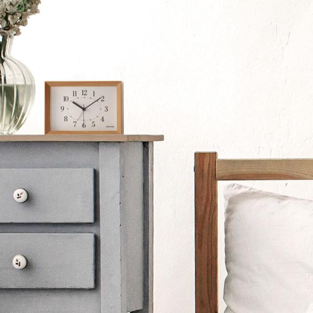 持ち運びしやすいA6サイズの本体で、時刻が見やすく、シェルフに置いても安定して使えます。掛置兼用クオーツ時計です。