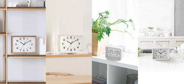 持ち運びしやすいA6サイズの本体で、時刻が見やすく、シェルフに置いても安定して使えます。掛置兼用クオーツ時計です。