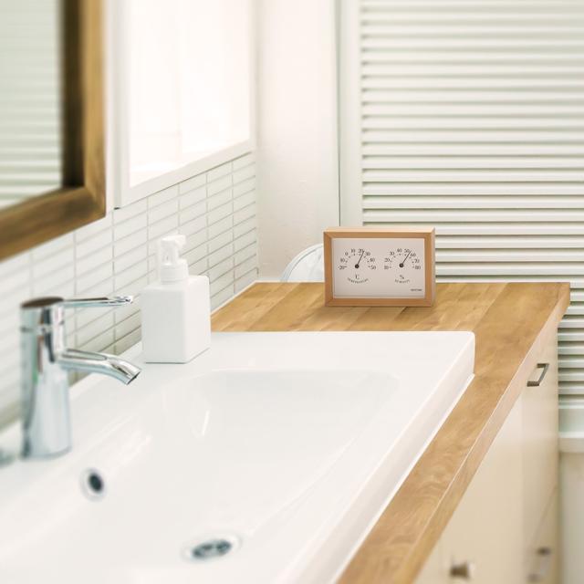 持ち運びしやすいA6サイズの本体で、時刻が見やすく、シェルフに置いても安定して使えます。掛置兼用温湿度計です。