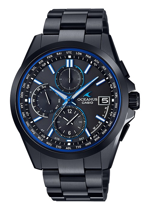 ケース・バンドにDLCコーティングを施し、高い耐摩耗性を実現。ブラックをベースすることで、オシアナスのブランドカラーであるブルーを際立たせる仕上げにしました。