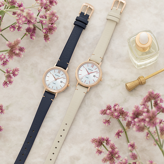 ミラネーゼバンドタイプからシルバーとピンクゴールドの2モデル、革バンドタイプからネイビーとホワイトの2モデルをそれぞれラインアップ。