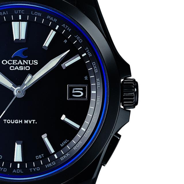 OCW-S100Bは、メタルパーツへのブラックIP処理×ガラス部分へのブルー蒸着の配色を採用することで、夜明け前の海をイメージしたクールなデザインに仕上げました。