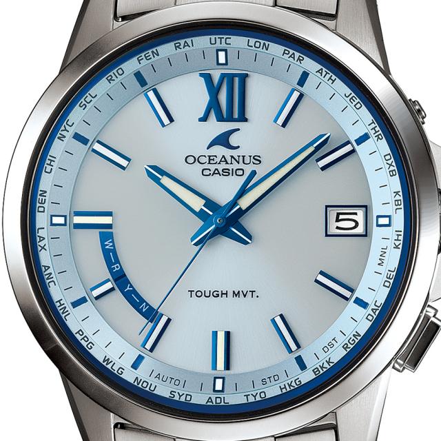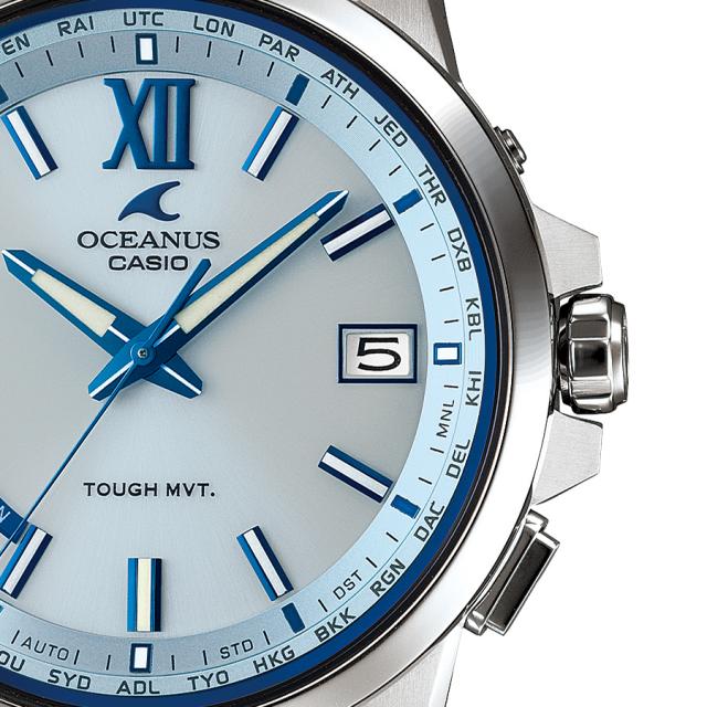 スポーティなデザインとスマートアクセスによる簡単操作を特徴としています。デザイン的な特徴はガラス径を大きくしたワイドフェイスとスマートアクセス搭載ながらも10.0mmの厚みを実現した薄型ケースです。サファイアガラスの裏の外周にブルーの蒸着を施し、ブランドカラーであるブルーが鮮やかに輝きます。ゆがみの少ない上質な仕上げのザラツ研磨や、美しく装着感の良い桟残し構造のバンドを採用するなど、細部にまで上質さにこだわっています。シンプルな3針アナログモデルながら、ワールドタイムを直感的に操作できるスマートアクセスや電波受信、タフソーラー、針位置自動補正、ハイブリッドマウント構造を持つタフムーブメントを搭載しています。シンプルながらもハイスペックを搭載したNew3針デイトオシアナスの登場です。