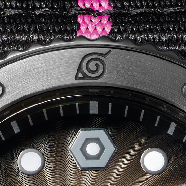 ベゼルにはそれぞれの里に所属する忍者の証である額当てを模した意匠と美しいヘアライン仕上げを施し、12時位置には木ノ葉隠れの里のマークが刻まれています。