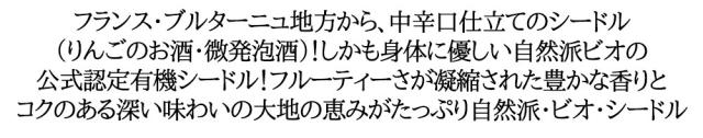![]() シードル ヴァル ド ランス オーガニック(中辛口) シードルはワインよりもアルコール度数が少なく、またポリフェノールを多く含み、ビタミン、ミネラル類、アミノ酸が豊富なヘルシー志向の飲み物です。ポリフェノールを多く含む皮部分が厚い、シードル専用りんごです。使用のリンゴも甘味、酸味、辛味、渋味などそれぞれ豊かな滋味を持つ40種類以上のりんごを厳選しブレンドしています。私たちが普段食べる食用りんごと比較すると、皮の厚いシードル専用りんごはポリフェノールが5倍以上含まれています。 すっきりとした口当たりのシードルは、どんな料理にも合います。魚介料理には辛さが特徴のシードルを、コクが豊かなシードルには肉料理、またそれぞれの料理に合うシードルの繊細な味や香りを探し選ぶことも奥深い楽しみです。この シードル ヴァル ド ランス ブーシェ オーガニック〈中辛口〉はブルターニュ産シードル専用有機りんごの一番搾りの果汁をタンクに入れ、天然の酵母により時間をかけてゆっくりと発酵・熟成させ、りんごの味と香りを豊かに引き出す伝統製法で造られたフルーティーさが凝縮された豊かな香りとコクのある深い味わいの大地の恵みがたっぷり自然派・ビオ・シードルです。食前酒に特におすすめです。 |