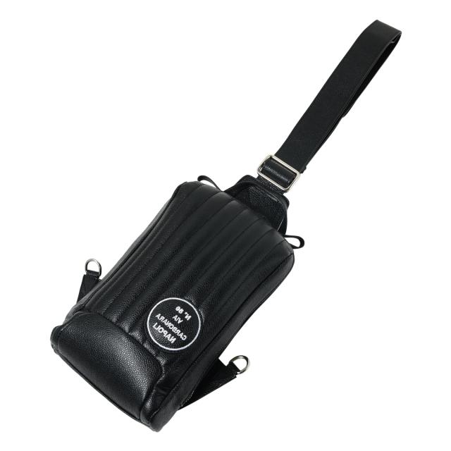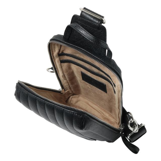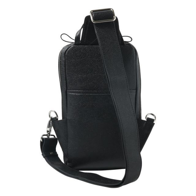 上品で味のあるキャビアスキンのレザーを使用し、荷物をコンパクトにまとめやすいタテ型ボディバッグは、中の荷物の全体が見やすくストレスなく使用できます。週末のお出掛けに最適です。