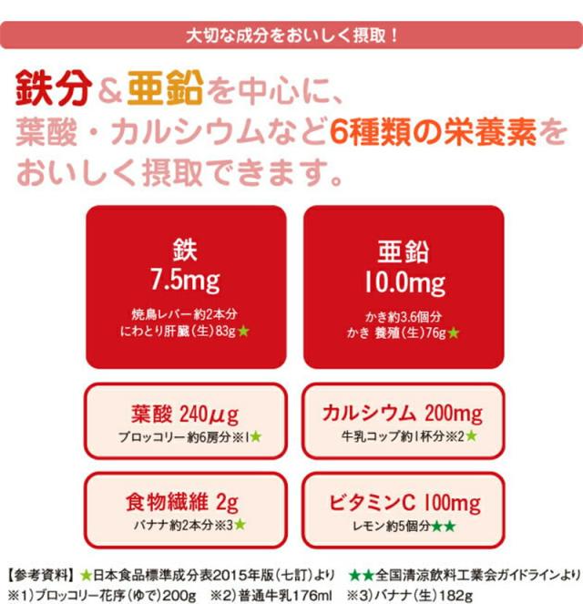 エネルギー 37kcal、たんぱく質 0g、脂質 0g、炭水化物 10g、糖質 8g、食物繊維 2g、食塩相当量 0.01g、鉄 7.5g、亜鉛 10.0mg、葉酸 240μg、カルシウム 200mg、ビタミンC 100mg