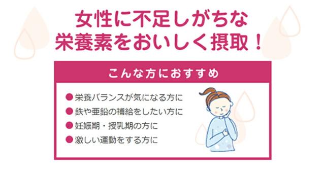 日本人女性に不足していると言われる鉄分、亜鉛に加え、葉酸、カルシウム、食物繊維、ビタミンCをバランスよく配合。偏りがちな現代女性の栄養バランスを手軽においしくサポートします。