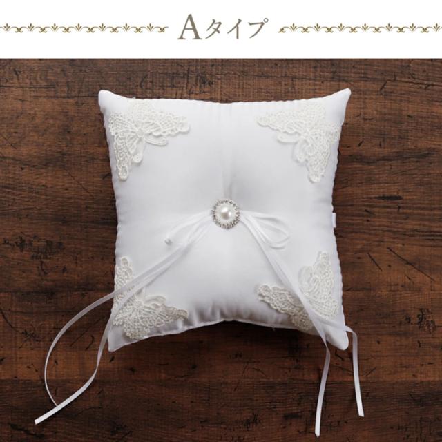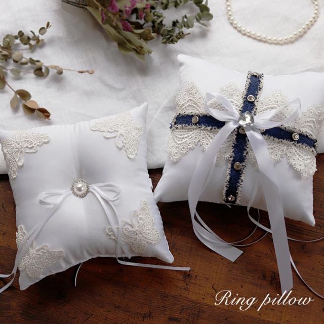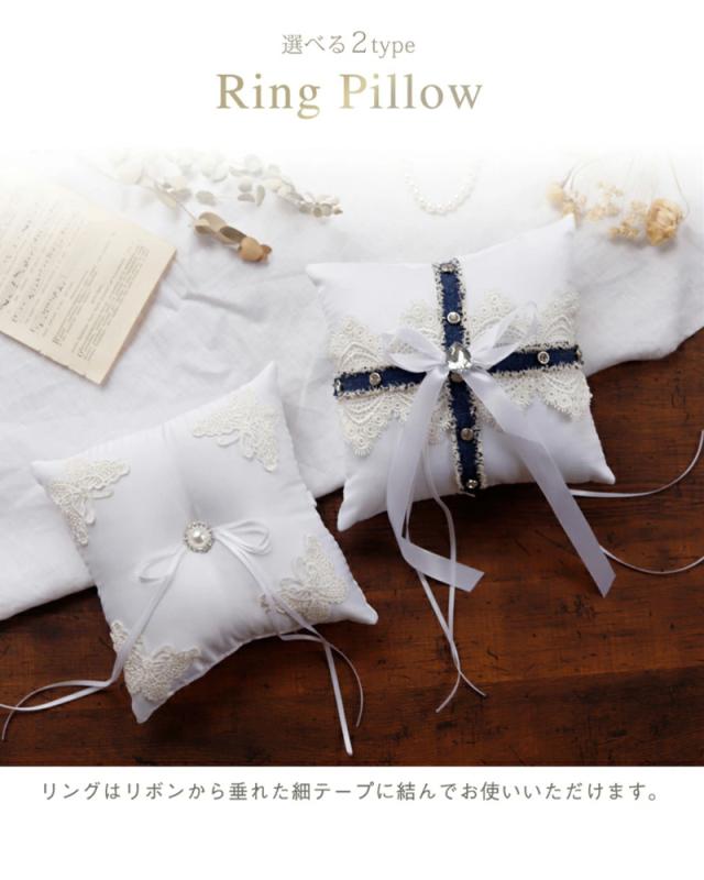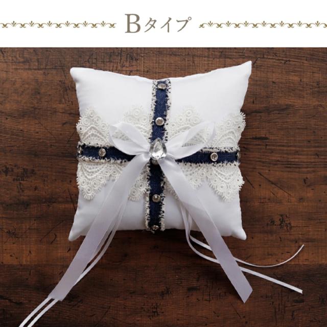 角四隅にあしらった蝶々型のレースが可愛いリングピロー(Aタイプ)と、青いリボンが特徴のお洒落なデザインのリングピロー(Bタイプ)をご用意いたしました