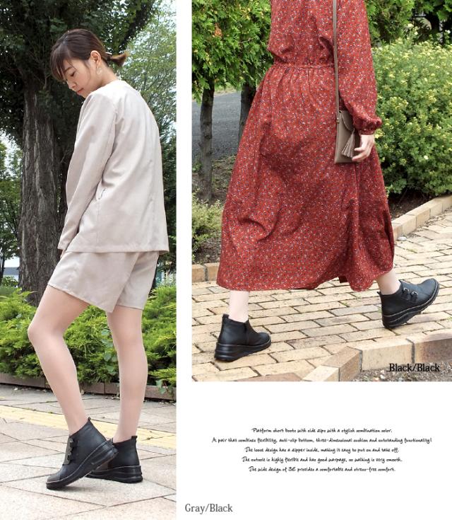 コンビカラーがおしゃれなサイドジップの厚底ショートブーツ。