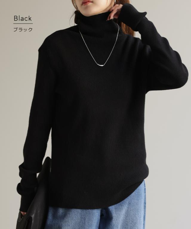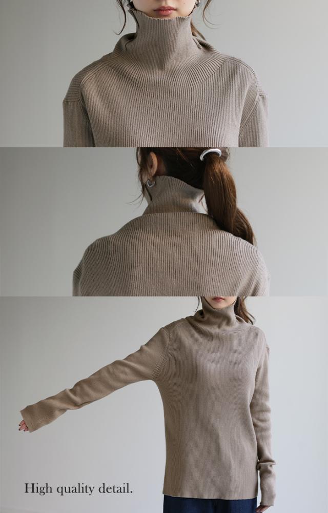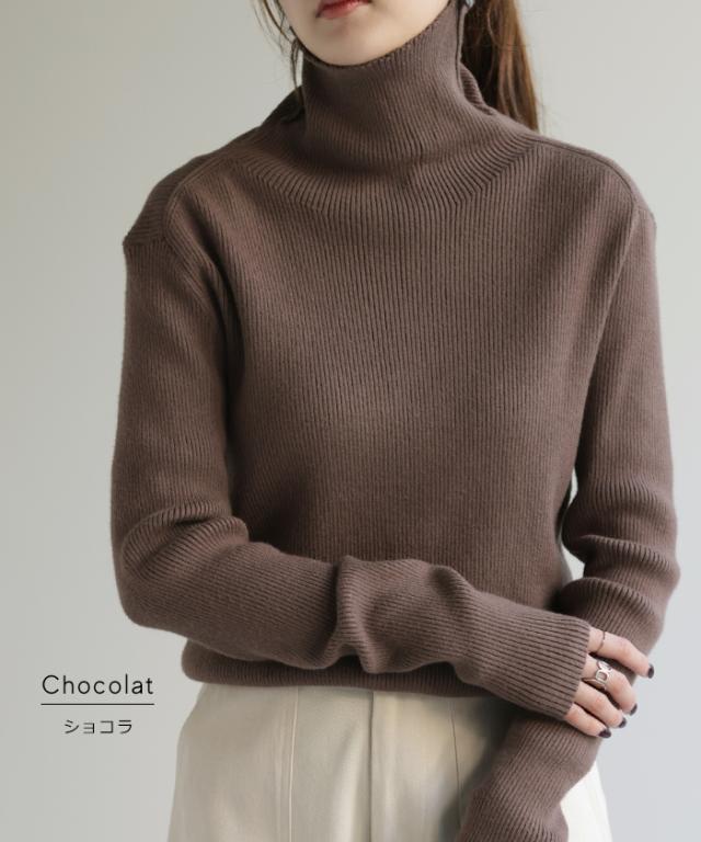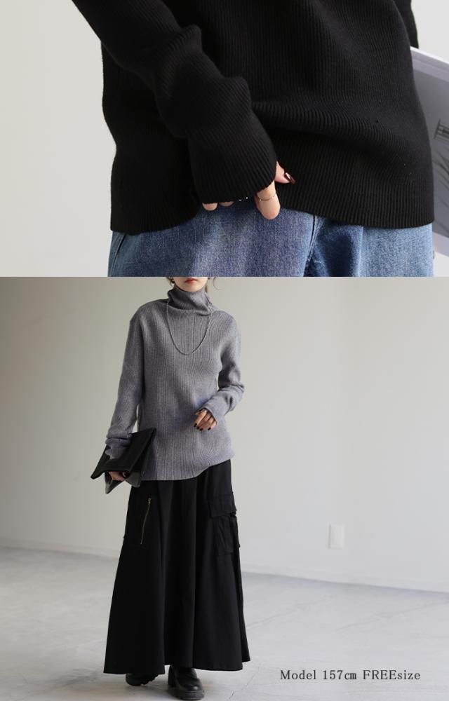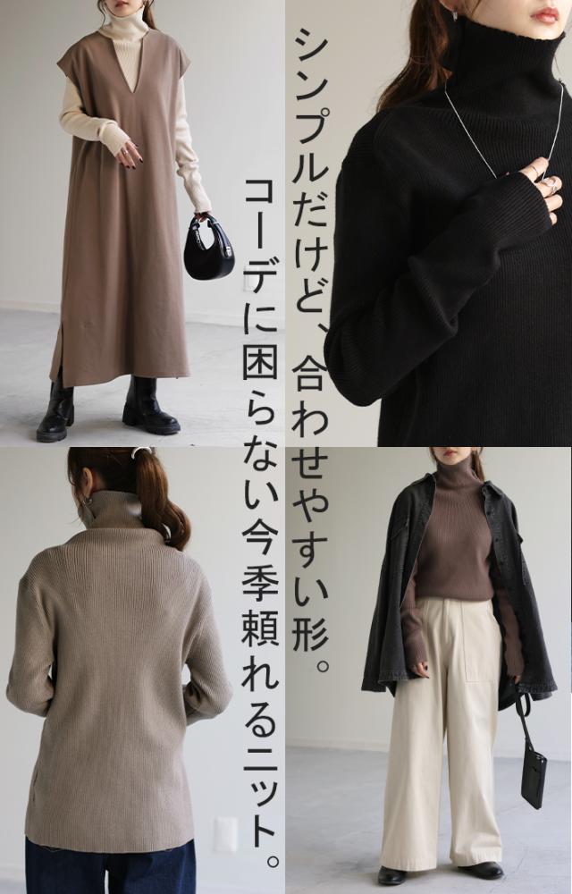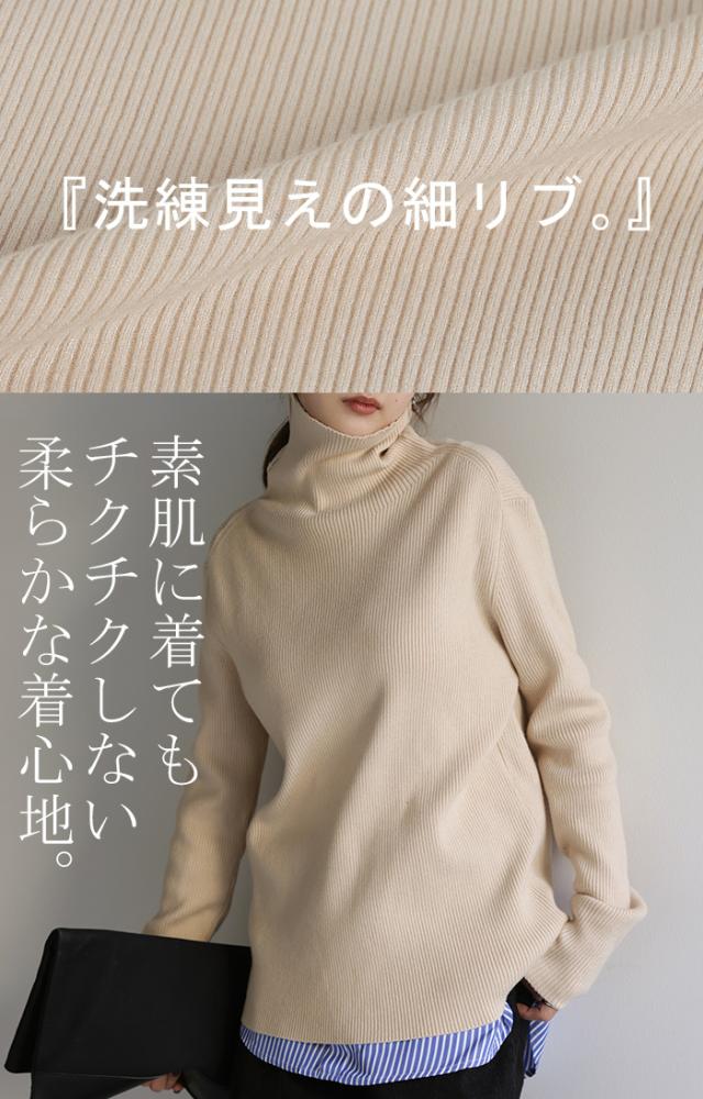 スッキリと細身えするリブ編みのタートルニット。