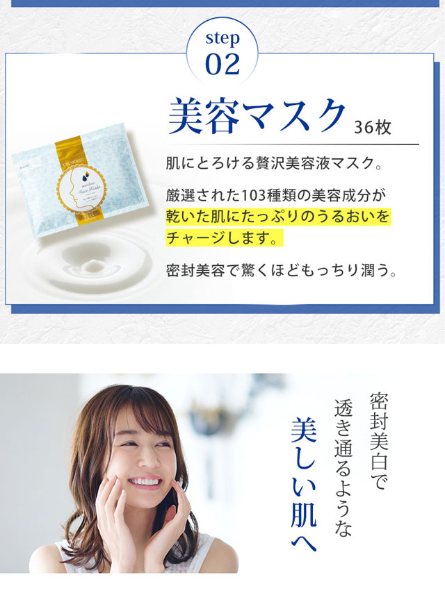 3種類の「コラーゲン」・3種の「ヒアルロン酸」・2種の「プラセンタエキス」の他、「セラミド」「エラスチン」など合計103種類もの美容成分を配合した贅沢なフェイスマスク。