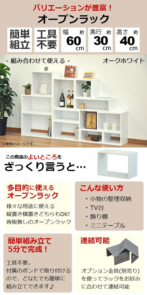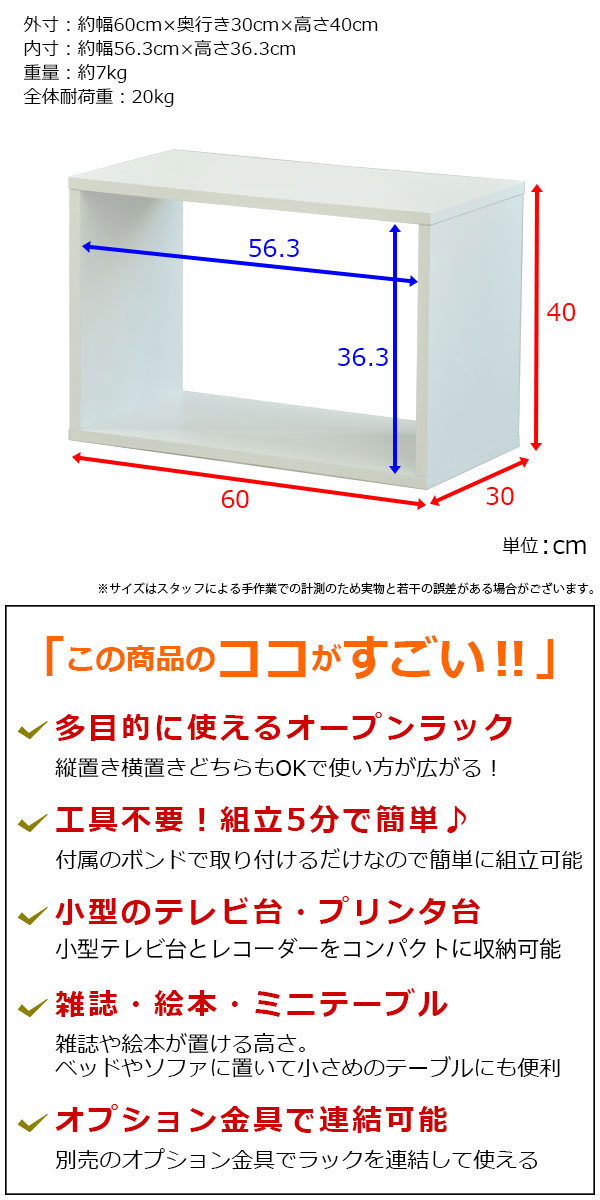 オープンラック 1段 60×40 奥行30cm A4対応 収納 棚 ホワイト 白 おしゃれ 組み合わせ自由 幅60cm 高さ40cm 頑丈 耐荷重20kg 積み重ね 収納 ラック ディスプレイラック 卓上ラック 飾り棚 本棚 コミック 漫画 雑誌 アクスタ 机上ラック モニター台 木製 1個単品