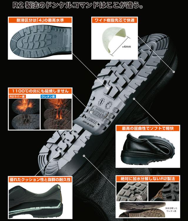 耐滑区分は「4」の最高水準、ワイド樹脂先芯で快適、最高の屈曲性でソフトで軽快、1100度の炎にも延焼しないR2ラバー底、優れたクッション性と抜群の耐久性と絶対に加水分解しないR2製法の靴底