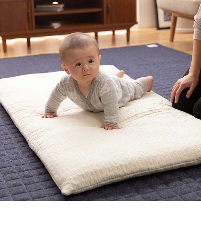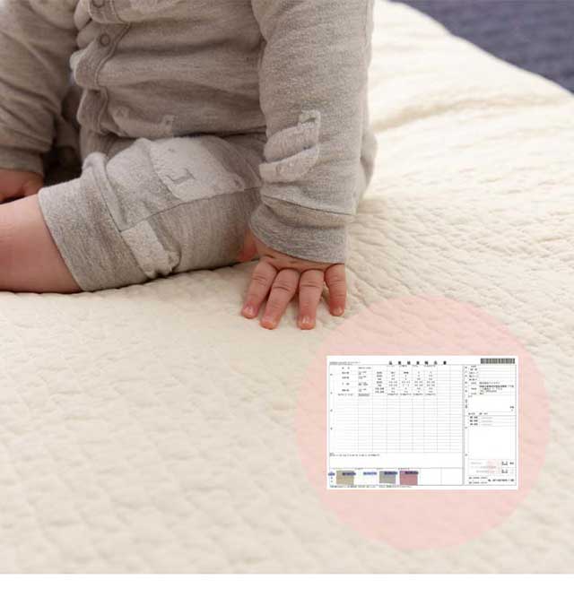 | 材質: [カバー] 表層:綿100% 中層:綿100%(200g/m2) 裏層:ポリエステル100% [ベビーマット本体] 側地:ポリエステル100% 詰め物:ポリエステル100%(固綿6cm(800g/m2)+巻綿(250g/m2)) |