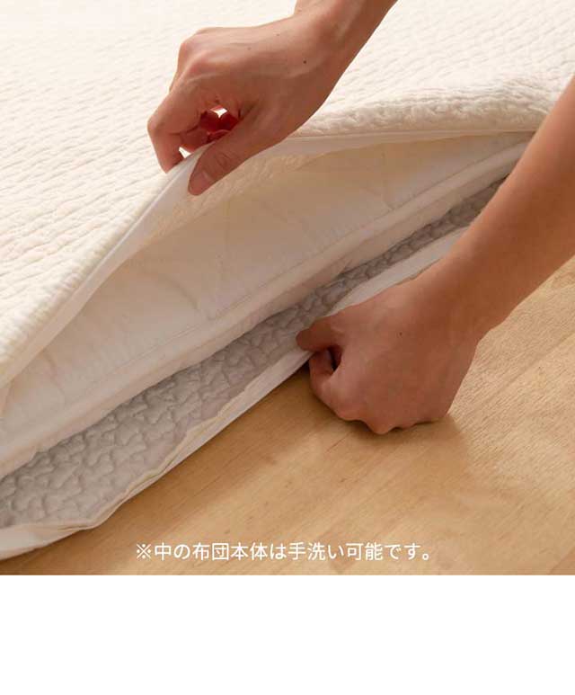 | 特記事項: ・タンブル(乾燥機)乾燥はお避けください。 ・洗濯ネットをご使用のうえ、単独洗いをお願いします。 ・無蛍光洗剤を使用してください。 ・この製品は色落ちする恐れがありますので、洗濯は白いものと一緒にしないでください。 ・素材の特性上、洗濯後は放置せず、すぐに形を整えて干してください。 【お洗濯のしかた】 ■カバー ・洗濯機を使用される場合、手洗いコースや弱水流でのお洗濯をおすすめします。 ■布団本体 ・液温は40℃を限度とし、手洗いしてください。 |