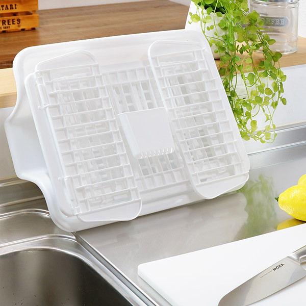水受けトレーには傾斜がついており、食器から落ちた水がそのままシンクへと流れていくため、水はけ抜群で水垢やヌメりもつきにくく乾きも早いです。また、かご側面は取り外しができ、隅々まで洗えていつも清潔にお使いいただけます。プラスチック製なので丈夫で軽く、お手入れも簡単で錆びの心配もありません。