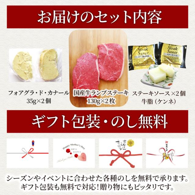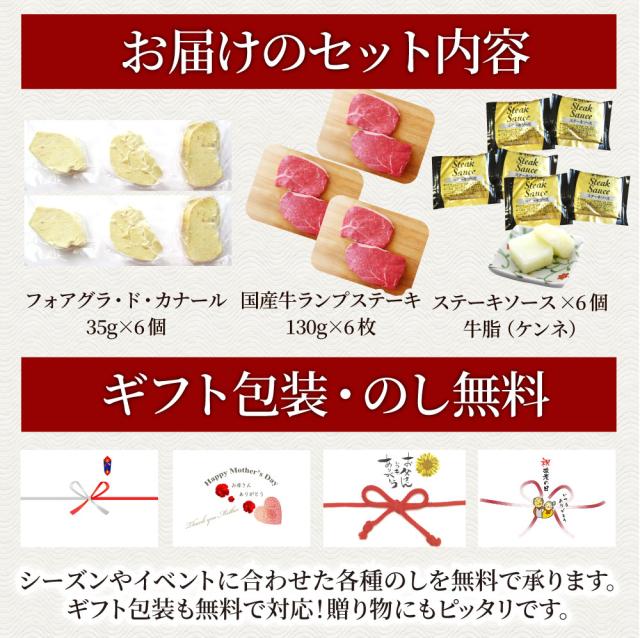 フォアグラ & 国産牛ランプステーキセット 6人前(フォアグラ6個&ステーキ130g×6枚)最高級 ハンガリー産 フォアグラ・ド・カナール 冷凍 通販 高級レストラン お得用 御歳暮 ギフト 食べ物 食品 プレゼント 女性 男性 人気 お祝い 新生活 送料無料 お肉の しゃぶまる