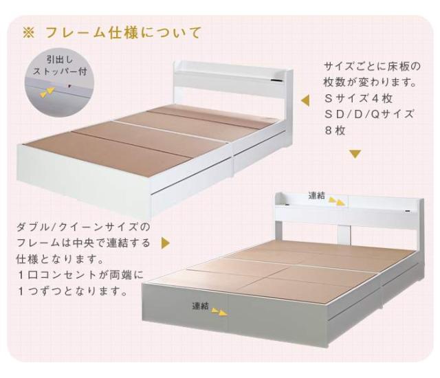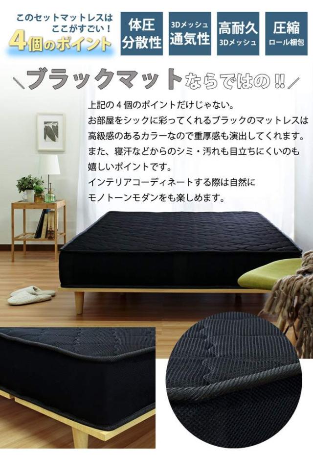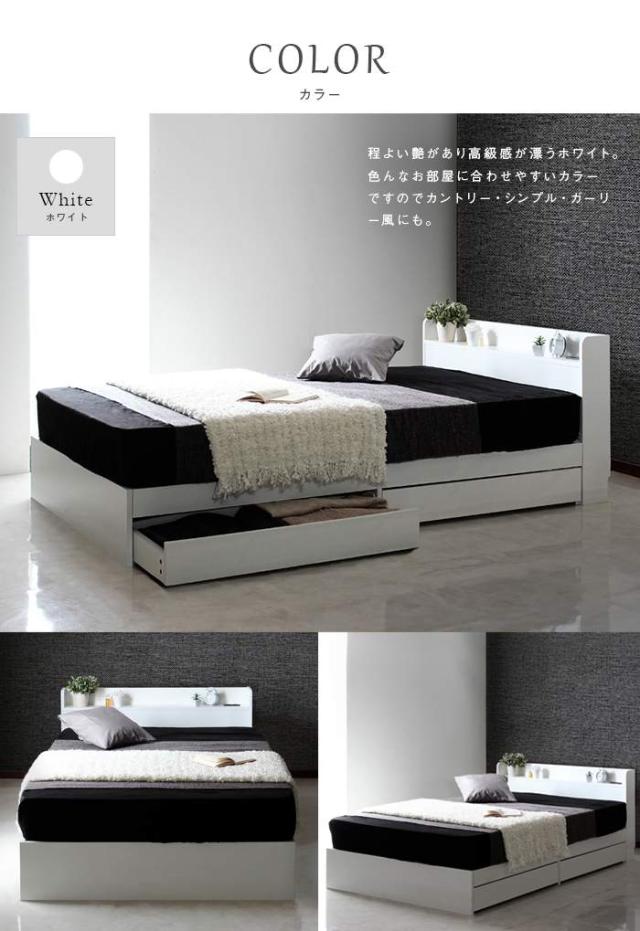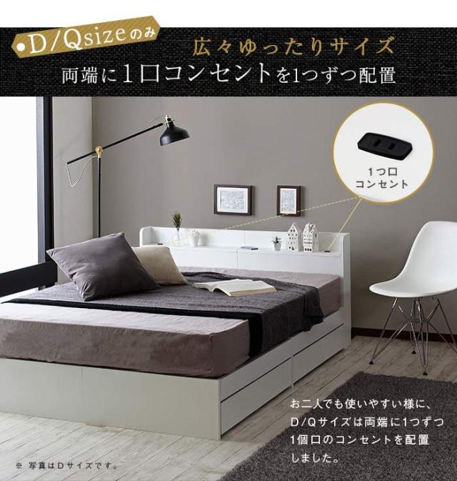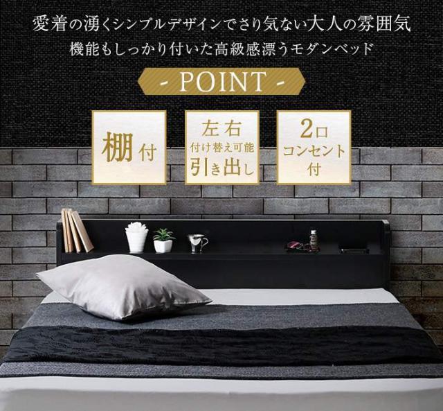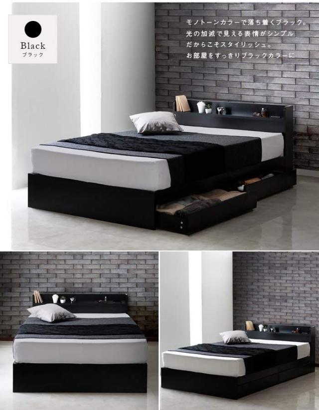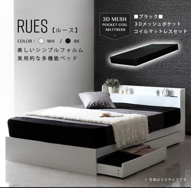 ベッド 棚付き 引出付 マットレス付き RUES【ルース】 送料無料 シンプルフォルムの多機能ベッド ダブルサイズ ブラックポケットコイルマットレス付
