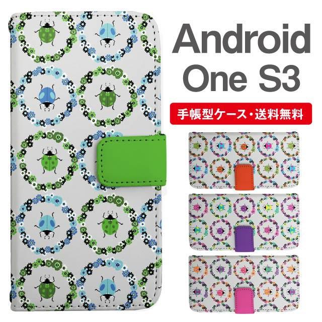 スマホケース 手帳型 Android One S3 アンドロイドワン 携帯ケース カバー 送料無料 てんとうむし フラワー 昆虫柄 花柄 agesugi_ssm