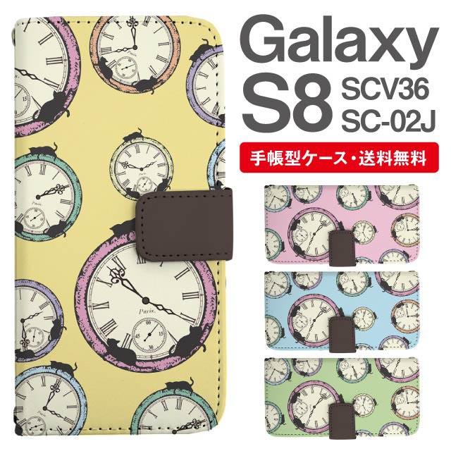 スマホケース 手帳型 Galaxy S8 ギャラクシー SC-02J SCV36 携帯ケース カバー 送料無料 ねこ 時計柄 猫 アニマル 動物 agesugi_ssm
