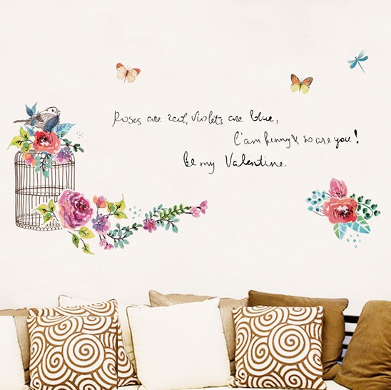 ウォールステッカー 鳥かごと花と蝶 英文字 壁紙シール 春 繰り返し貼れる ガーデン モチーフ 筆記体 玄関 ドア 階段 部屋飾り 結婚式