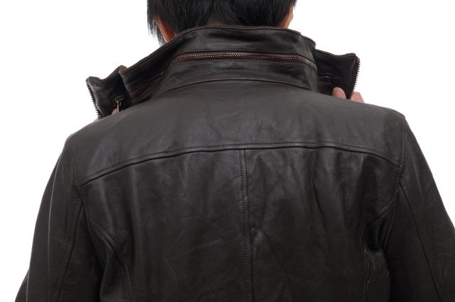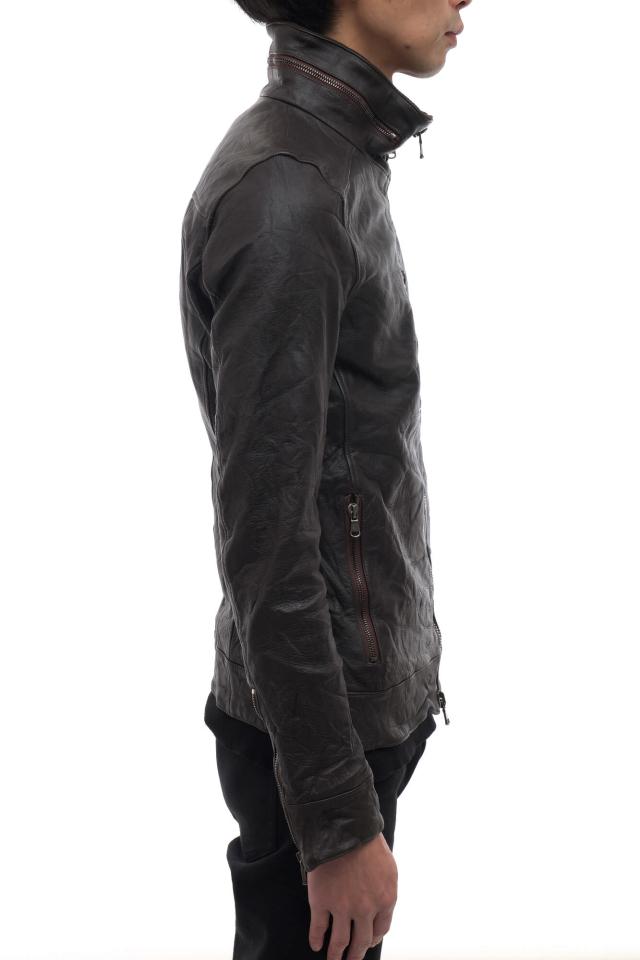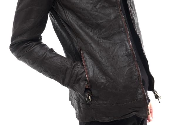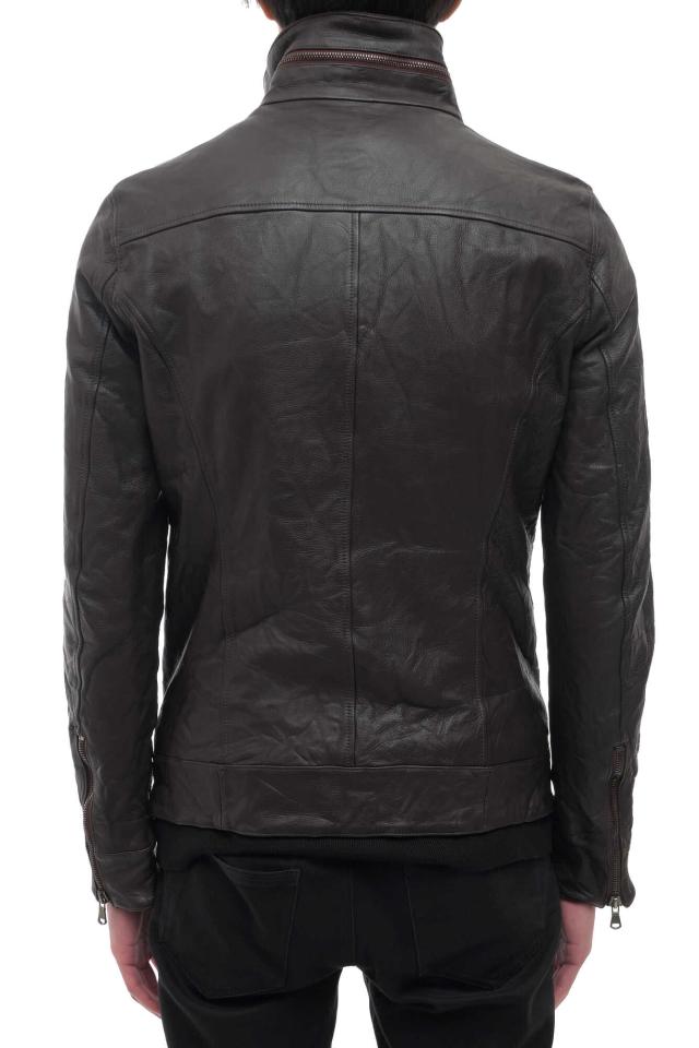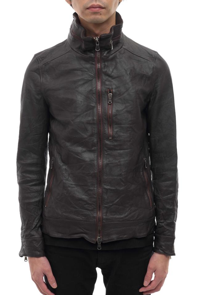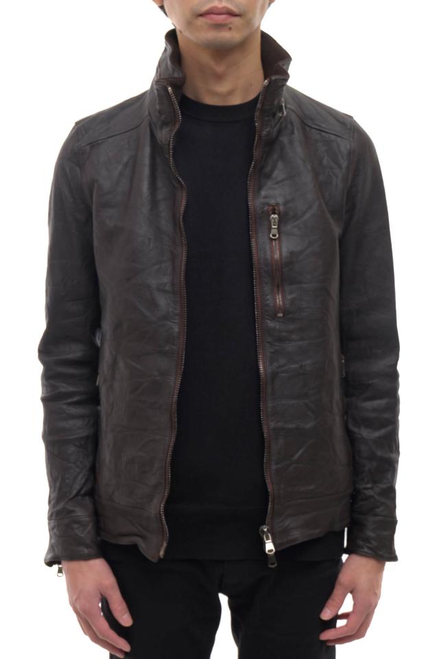 レザーにはシワ加工が施されており、デザインとしてもシルエットとしても非常にかっこいいブルゾン。スタンド襟の内側はリブ仕様、どんな服装にも合わせやすいので重宝する逸品です。