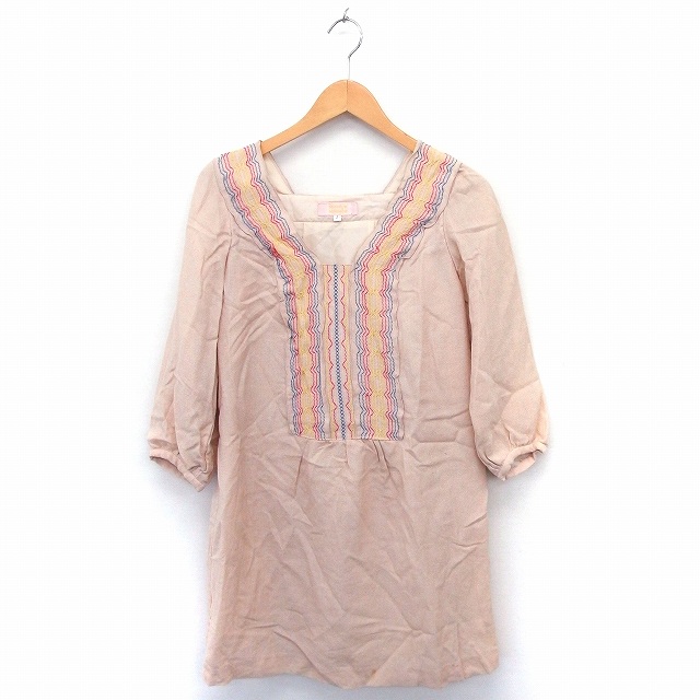 【中古】ミニマム MINIMUM ワンピース 刺繍 スクエアネック 七分袖 ひざ丈 ウール 2 ベージュ /FT48 レディース