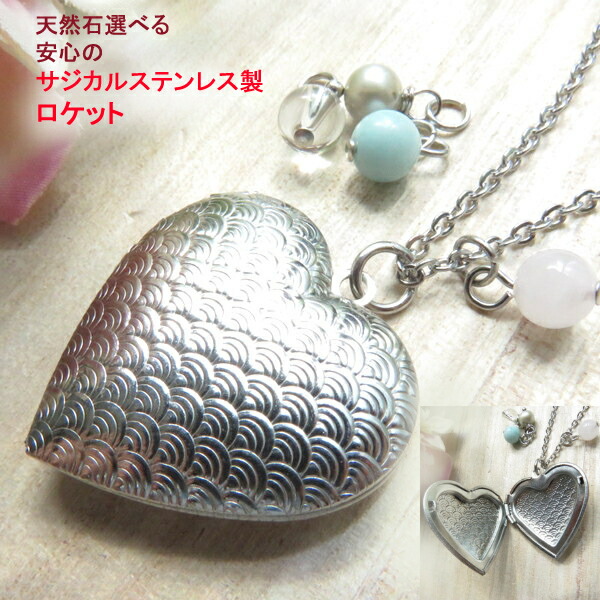 ロケットペンダント サジカル サージカル ステンレス ハート 文様 アンティーク ロケット 写真 ネックレス 天然石 ローズクオーツ 水晶 アマゾナイト アレルギー対応 記念日 誕生日 プレゼント ギフト 贈り物 遺骨 遺髪 メモリアル 父 母 クリスマス 母の日 可愛い きれい