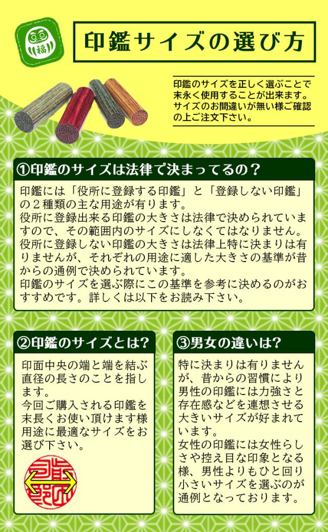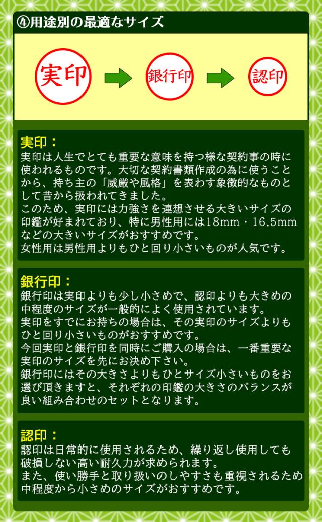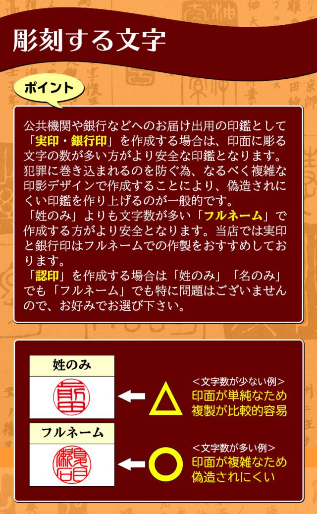 印鑑の「良し悪し」は印面のデザインで大きく変わりますので大切なご印鑑購入の際には一番注意すべきポイントとなります。当店ではお客様のお名前の文字の組み合わせに合わせて一文字一文字、細部に到るまで丁寧に微調整を繰り返しながら最適のバランスに仕上げております。信頼の技術で一本一本心を込めながら、高品質の印材に美しく縁起の良い印面デザインを施した印鑑をお届け致します。