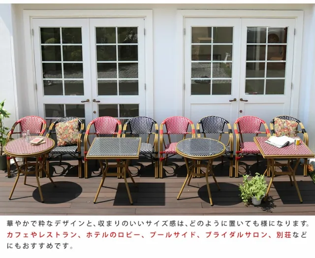 | ■サイズ(約) | テーブル:幅 700×奥行 700×高さ 745mm チェア:幅 580×奥行 600×高さ 820mm 座高 450mm |