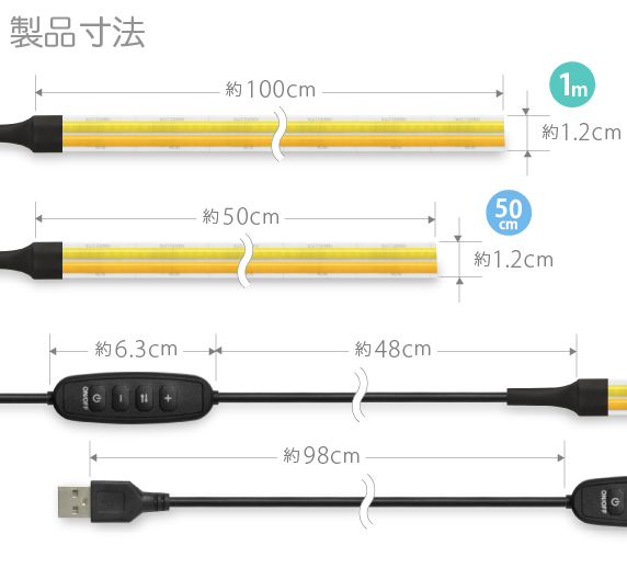 | ライト部:約 長さ 100cm×幅1.2cm USBケーブル長:約 150cm |