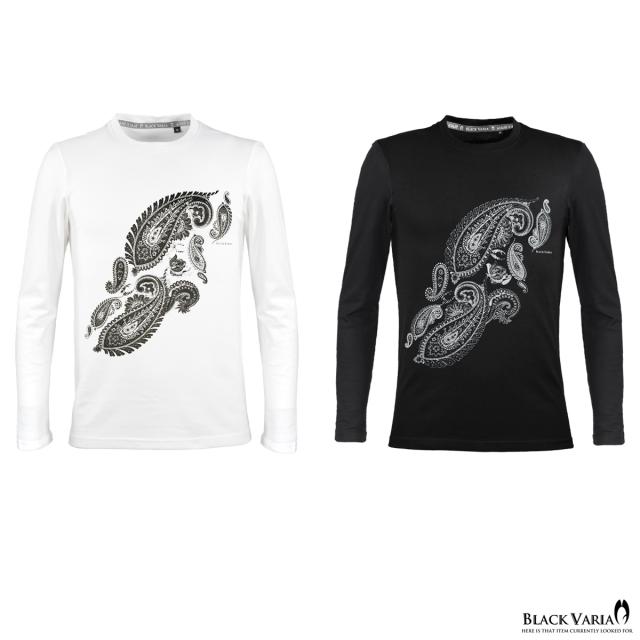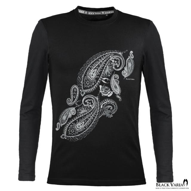メール便可/1枚まで Tシャツ 長袖 クルーネック ペイズリー ペイズリー柄 プリント 丸首 メンズ スリム 細身(ブラック黒) crzkk039ls